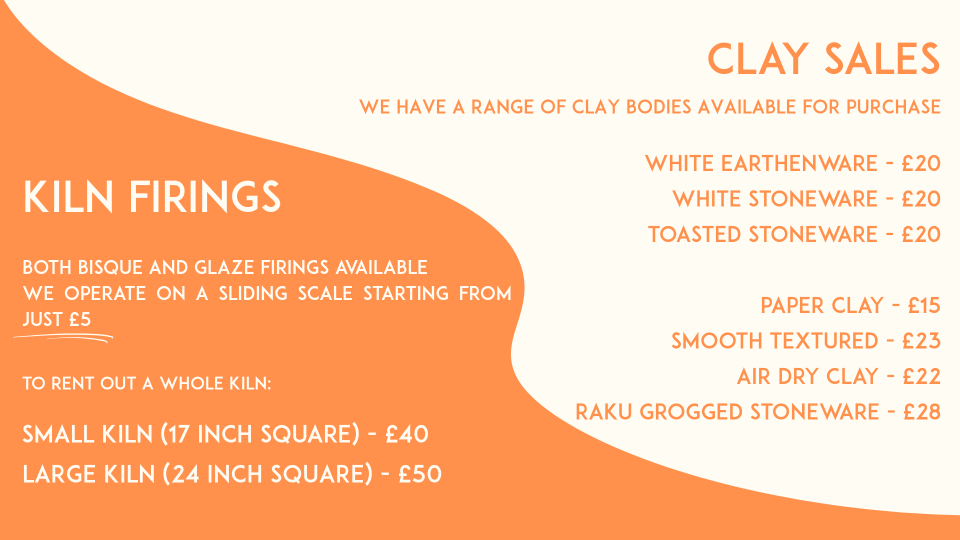 Use of the studio, tools, wheels, whirlers/banding wheels, sticks, batts, brushes, ect. are all included and free to use as you make. Clay can be purchased separately from just £8.50 for a 13lb bag of reclaim, use of slips, glazes, underglazes, and kiln firings all purchased separately.